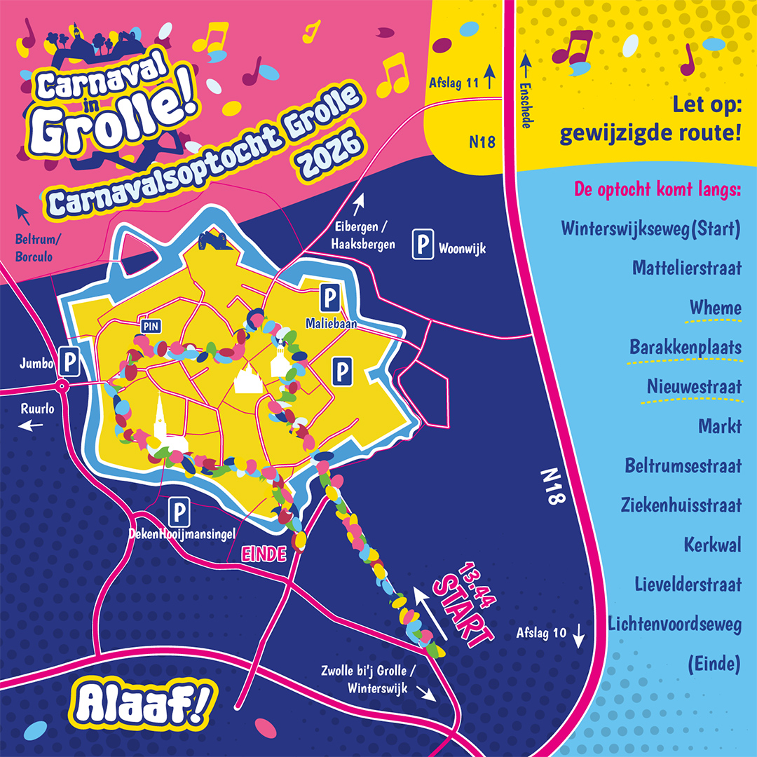 De Grolse Carnavalsoptocht blijft groeien en dat is hartstikke jofel! Door het grote aantal deelnemers en de verwachte drukte langs de route is het parcours op één punt iets aangepast. Zo zorgen we voor een veilige doorgang én extra ruimte op de Markt, zodat iedereen volop kan genieten van al het ‘spul dat d’r an kump!’