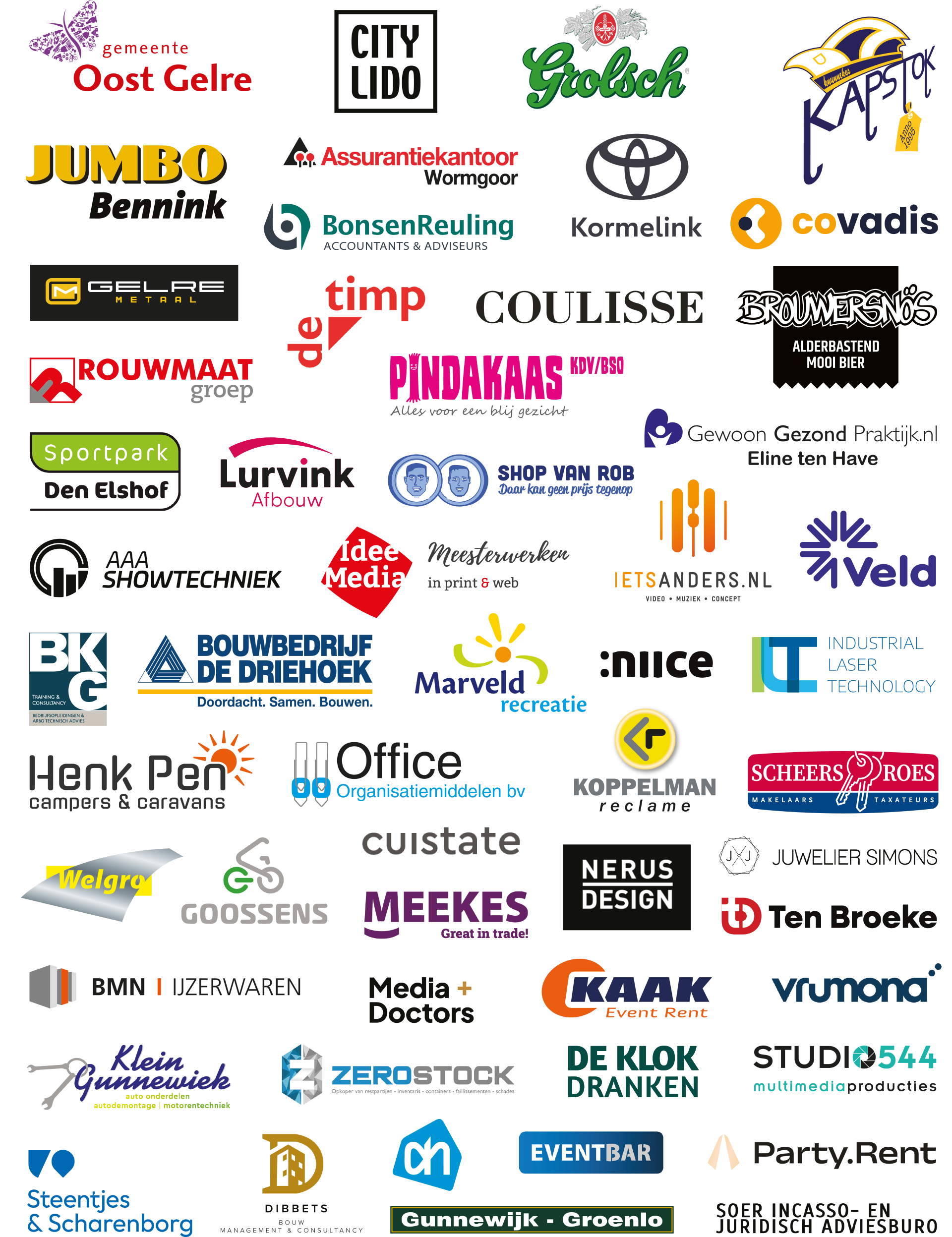 Reukers schilders Skuur Thuinte Bouw Tompro Virupa BV Vormfactor Wellink – Welrent Winterwarm Edprint Poelhuis promotie Warenhuis Post Groot Kormelink Bloem & Kado CEB Reusen Nyink Rooks Floor & More Bar 700 Café de Kroon Cubanos De Mattelier |